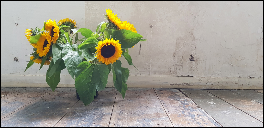 Zonnebloemen bij een expositie in boerderij Oud Bokum in Kloosterburen.